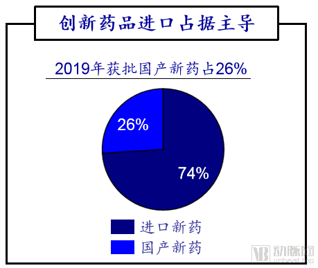 在創(chuàng)新藥品方面,境外企業(yè)占據(jù)主導(dǎo)地位。2019年,NMPA共批準(zhǔn)53個(gè)新藥,其中進(jìn)口新藥共39個(gè),國產(chǎn)新藥僅14個(gè),國產(chǎn)占比26.4%。