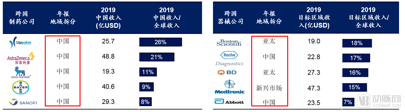跨國制藥公司與跨國器械公司的中國區(qū)收入