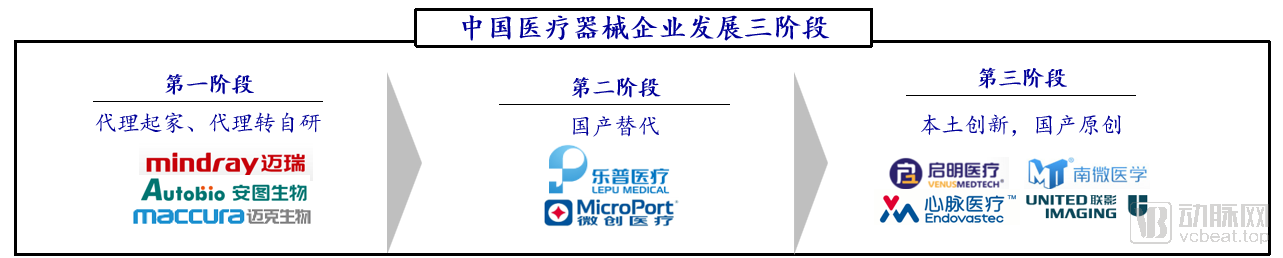 中國醫(yī)療器械企業(yè)發(fā)展至今,大概可分為三個(gè)階段。第一階段,以邁瑞醫(yī)療、安圖生物、邁克生物等為代表的國產(chǎn)企業(yè),從代理起家,由代理轉(zhuǎn)為自主研發(fā),研發(fā)的產(chǎn)品也逐漸從低端走向高端。