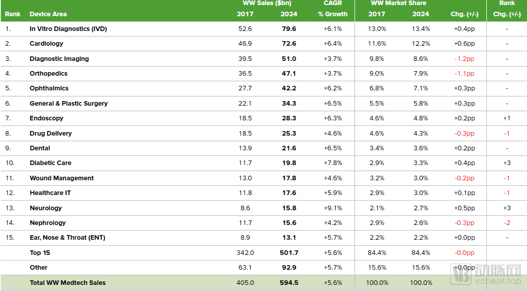 根據(jù)全球咨詢公司Evaluate發(fā)布的報(bào)告《Evaluate MedTech, World Preview 2018,Outlook to 2024》,IVD、心血管、影像、骨科、眼科是全球市場(chǎng)規(guī)模最大的幾個(gè)領(lǐng)域。