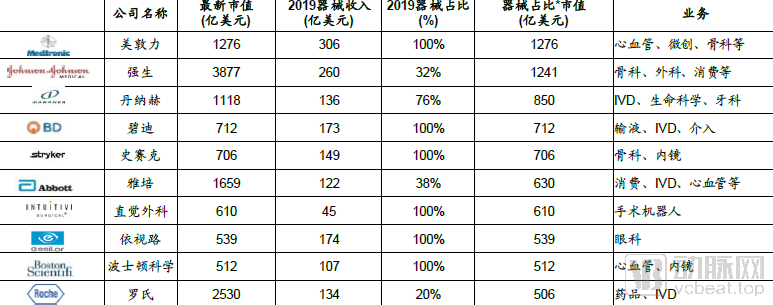 全球市值TOP10器械企業(yè)業(yè)務(wù)領(lǐng)域