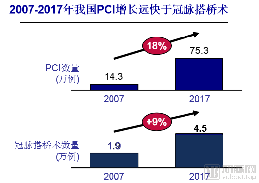 微創(chuàng)介入治療發(fā)展迅速,2007年我國開展PCI共14.3萬例,同期冠脈搭橋1.8-2萬例,據(jù)中國心血管病報(bào)告,2017年全國開展PCI共75.3萬例,據(jù)2017年中國心外科手術(shù)和體外循環(huán)數(shù)據(jù)白皮書,同期冠脈搭橋術(shù)4.5萬例,PCI增速遠(yuǎn)快于冠脈搭橋術(shù)。微創(chuàng)介入手術(shù)量的迅速增長(zhǎng)提高了相關(guān)醫(yī)療器械的市場(chǎng)滲透率,也培育了市場(chǎng),為微創(chuàng)介入治療市的場(chǎng)爆發(fā)奠定了基礎(chǔ)。