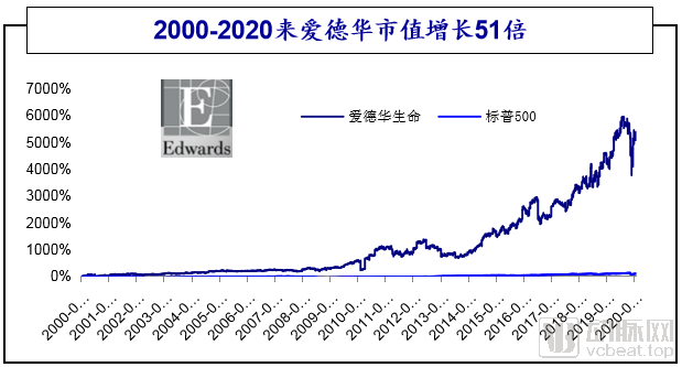 愛德華生命科學(xué)2007年以前主營心臟瓣膜和心臟重癥監(jiān)護(hù),公司發(fā)展的主要拐點(diǎn)發(fā)生在2007年,其顛覆式創(chuàng)新器械經(jīng)導(dǎo)管心臟瓣膜Edwards SAPIEN在歐洲上市,此后公司進(jìn)入發(fā)展快車道。隨著二、三代經(jīng)導(dǎo)管心臟瓣膜SAPIEN XT和SAPIEN 3的推出以及TAVR逐步拓展到中危重度主動(dòng)脈瓣狹窄患者,公司經(jīng)導(dǎo)管主動(dòng)脈瓣收入爆發(fā)式增長(zhǎng),市值亦一路上漲。自2000年以來公司市值從8.5億美元增長(zhǎng)至439.9億美元,實(shí)現(xiàn)了51倍的增長(zhǎng)。愛德華生命科學(xué)的成功可以證明,微創(chuàng)介入治療在國內(nèi)也有著巨大的發(fā)展機(jī)會(huì)。