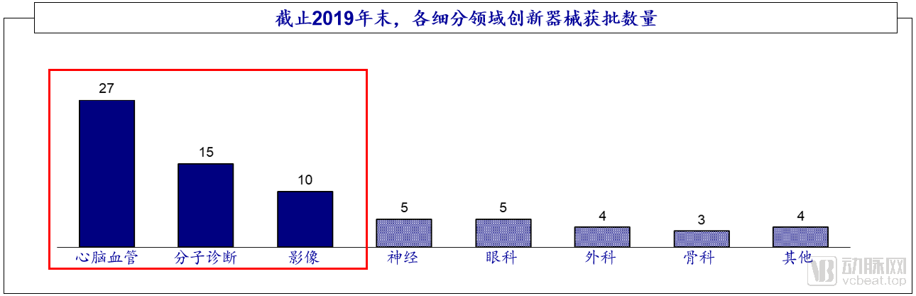 另一個(gè)維度,從創(chuàng)新活躍度來看,國內(nèi)心腦血管、分子診斷、影像領(lǐng)域創(chuàng)新活躍。2014年國家創(chuàng)新醫(yī)療器械特別審查程序開啟以來,截止2019年末,共批準(zhǔn)73個(gè)創(chuàng)新器械,其中心腦血管器械27個(gè),占比37%,分子診斷和影像分別為15、10個(gè),占比21%、14%,其他領(lǐng)域有神經(jīng)(7%)、眼科(7%)、外科(5%)、骨科(4%)等。