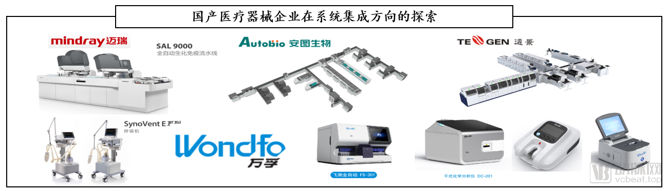 系統(tǒng)集成亦是創(chuàng)新的方向之一,國產(chǎn)醫(yī)療器械公司積極在此方向探索。例如,安圖生物醫(yī)學(xué)實(shí)驗(yàn)室全自動(dòng)流水線 Autolas A-1 Series,邁瑞SAL 9000全自動(dòng)生化免疫流水線,透景生命全自動(dòng)高通量免疫檢測(cè)系統(tǒng),邁瑞重癥監(jiān)護(hù)室整體解決方案,萬孚免疫熒光平臺(tái)、電化學(xué)的血?dú)?、凝血、干涉生化等幾款儀器組合的“一平米實(shí)驗(yàn)室”概念。