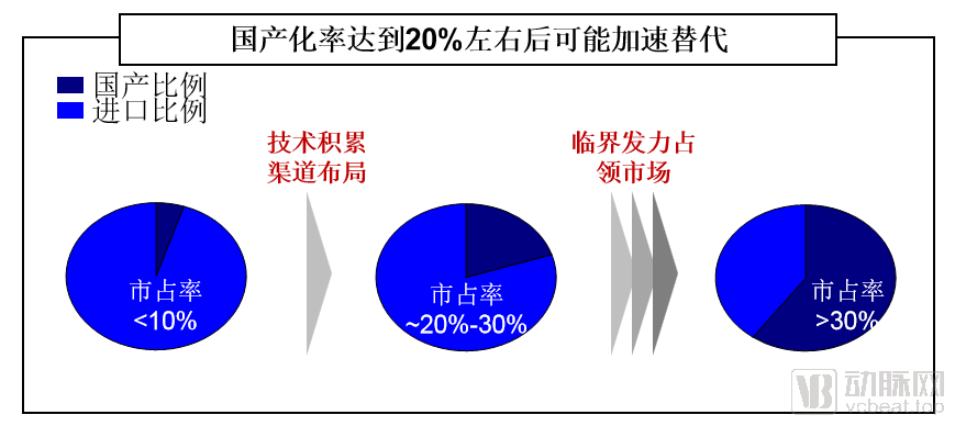 國產(chǎn)化率0-10%的過程往往是技術(shù)積累、布局渠道的過程,當(dāng)國產(chǎn)比例達(dá)到20%-30%這一臨界范圍,代表國產(chǎn)技術(shù)和渠道在該類醫(yī)療器械中已具備較好的基礎(chǔ),在政策等外部催化下將加速滲透,可能快速完成30%到>50%的國產(chǎn)替代進(jìn)程。