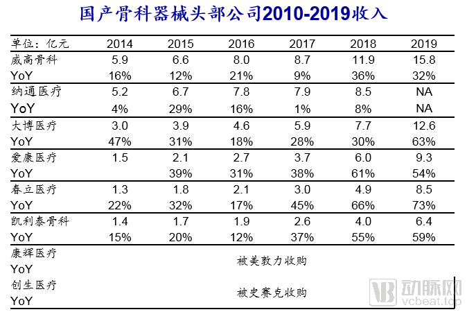 骨科領(lǐng)域,國內(nèi)骨科器械頭部企業(yè)穩(wěn)步高速發(fā)展。威高骨科、納通醫(yī)療、大博醫(yī)療、愛康醫(yī)療、春立醫(yī)療、凱利泰骨科等企業(yè),在2010-2017年,每年的收入增長(zhǎng)率大約保持在10%-30%,而2018年后,收入增長(zhǎng)率約為50%-70%,說明相關(guān)企業(yè)發(fā)展迅速。