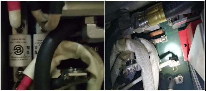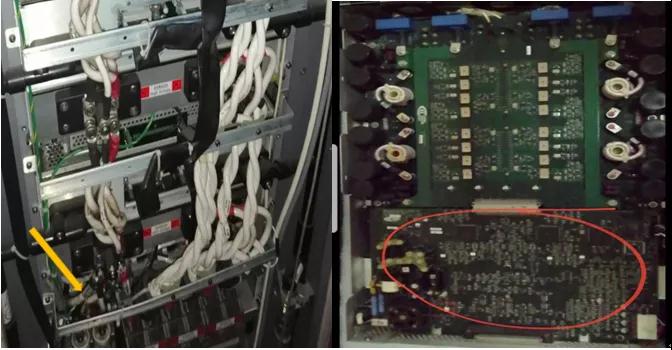 檢查電容組,拆出后發(fā)現(xiàn)有并聯(lián)鋁條有變形的情況且有接地表面有打火痕跡,校正鋁條,測(cè)量各電容阻值未見與其他沒有明顯區(qū)別。