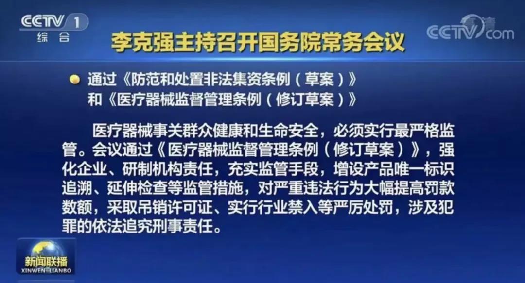 12月21日,據(jù)新聞聯(lián)播消息,國務(wù)院總理主持召開國務(wù)院常務(wù)會(huì)議,會(huì)議通過《醫(yī)療器械監(jiān)督管理?xiàng)l例(修訂草案)》,內(nèi)容指出將強(qiáng)化企業(yè)、研制機(jī)構(gòu)對(duì)醫(yī)療器械安全性有效性的責(zé)任,明確審批、備案程序,充實(shí)監(jiān)管手段,增設(shè)產(chǎn)品唯一標(biāo)識(shí)追溯、延伸檢查等監(jiān)管措施。