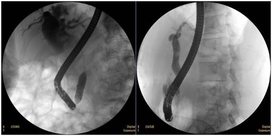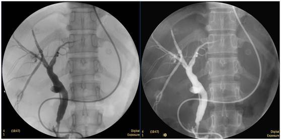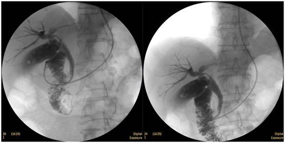 立位注入造影劑,膽總管顯影好,稍擴張,未見結(jié)石影。
