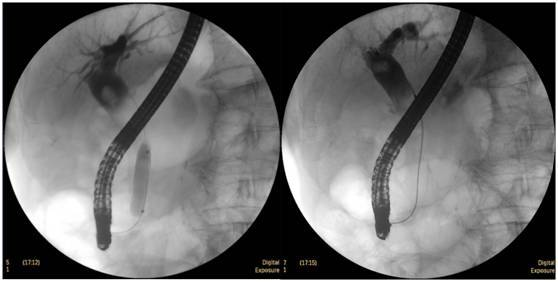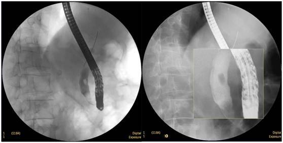 柱狀球囊擴張完全,膽總管擴張,下段見充盈缺損影。