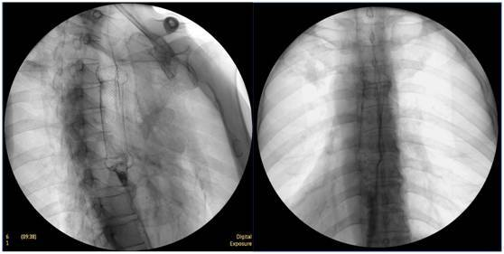 食管癌并狹窄內(nèi)鏡下擴張支架植入術(shù),支架在脊柱背景下依然能清晰顯示。