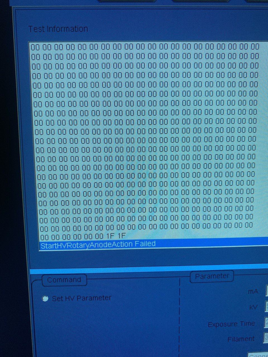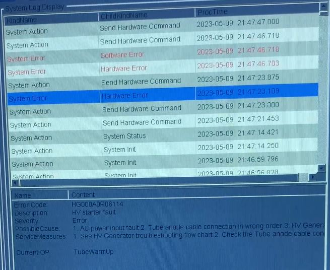 在設(shè)備日志文件中檢測(cè)到錯(cuò)誤:“硬件錯(cuò)誤 HG000A0R06114”。嘗試預(yù)熱射線管后會(huì)出現(xiàn)此錯(cuò)誤,表明設(shè)備的高壓部分(發(fā)生器、逆變器、X 射線管)出現(xiàn)故障。