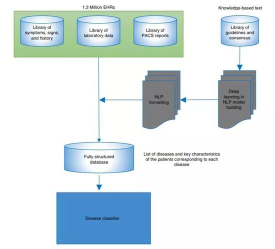 尤其值得一提的是,針對(duì)電子病歷中醫(yī)生記錄的診斷文本,研究人員建立了一套自然語(yǔ)言處理模型進(jìn)行信息提取。在這一階段,兩個(gè)研究機(jī)構(gòu)的醫(yī)生和科學(xué)家通力合作,由高級(jí)主治醫(yī)師和信息學(xué)研究人員組成的專家團(tuán)隊(duì)手動(dòng)給電子病歷上的6000多張圖表進(jìn)行注釋,對(duì)模型進(jìn)行訓(xùn)練和檢驗(yàn)。高質(zhì)量的數(shù)據(jù)輸入成為這套系統(tǒng)的關(guān)鍵優(yōu)勢(shì)。